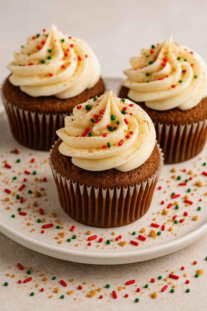 Soft, warmly spiced cupcakes topped with rich cream cheese frosting — the perfect bite of holiday cheer!