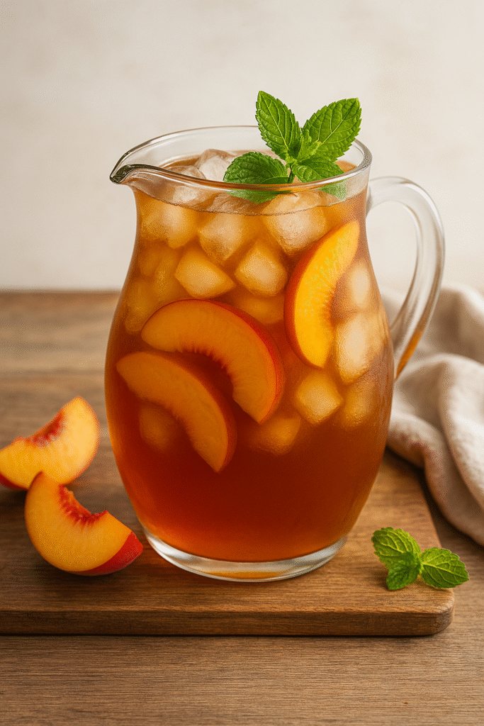 Sweet, fruity, and perfectly chilled — this Southern Peach Iced Tea combines homemade sweet tea with peach syrup for a refreshing, golden sip of Southern comfort.